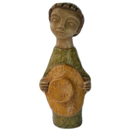 Shepherd with a hat, in colored reconstituted stone, made by the Little Sisters of Bethlehem. It is 13 cm high and complements the crib, available in the same collection. Ideal for an original and timeless Christmas decoration.