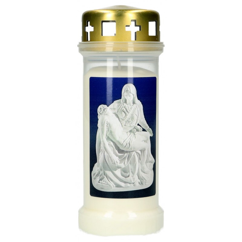 Candle with a golden cover for outdoor. Candle's height : 17 cm, Cap's height : 2.5 cm, Diameter : 6 cm