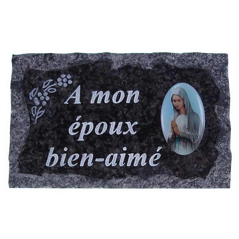 To pay tribute to a deceased relative, we offer many plates of cemeteries with a base. Our funerary plates are all decorated with a medal of Our Lady of Banneux. They are to put on the grave and can be used as little gravestones.