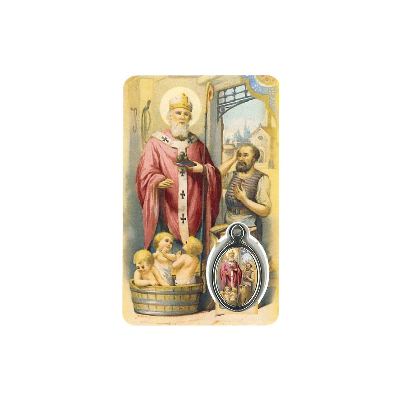 Card with prayer and medal St Nicolas in French