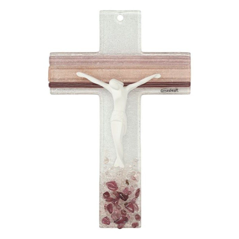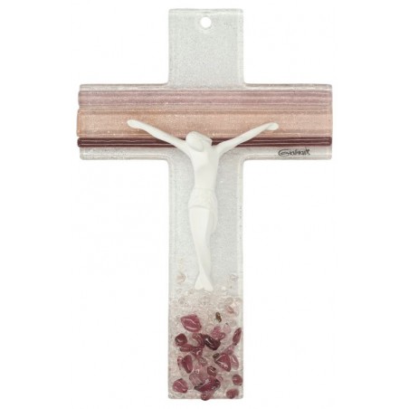 Wall cross in glass 16 cm purple/pink withe Christ