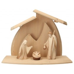 Sainte Famille en bois sculpte 10 cm + Cabane avec lumière