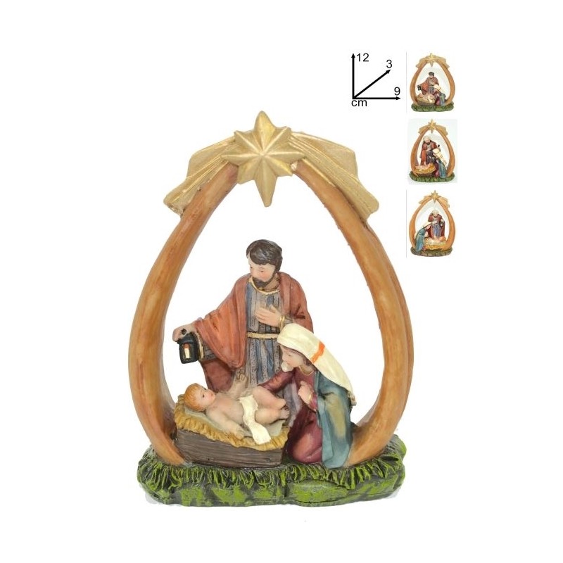 Small manger colored resin composed of the Virgin Mary, St. Joseph and baby Jesus, arranged under an arch formed by the star. There are 3 models available. It measures 12 x 9 x 3 cm. It is ideal for a Christmas decoration in soft colors and affordable.