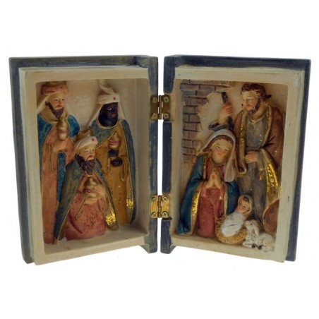 Nativity composed of the Holy Family and the Magi, in book form, in colored resin. It measures 13.5 x 18.5 x 3 cm. It is ideal for a Christmas decoration combining tradition and originality.