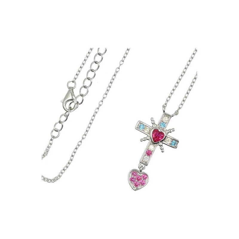 ;cross;rhodium;silver;and;multicolored;zirons;heart;chain