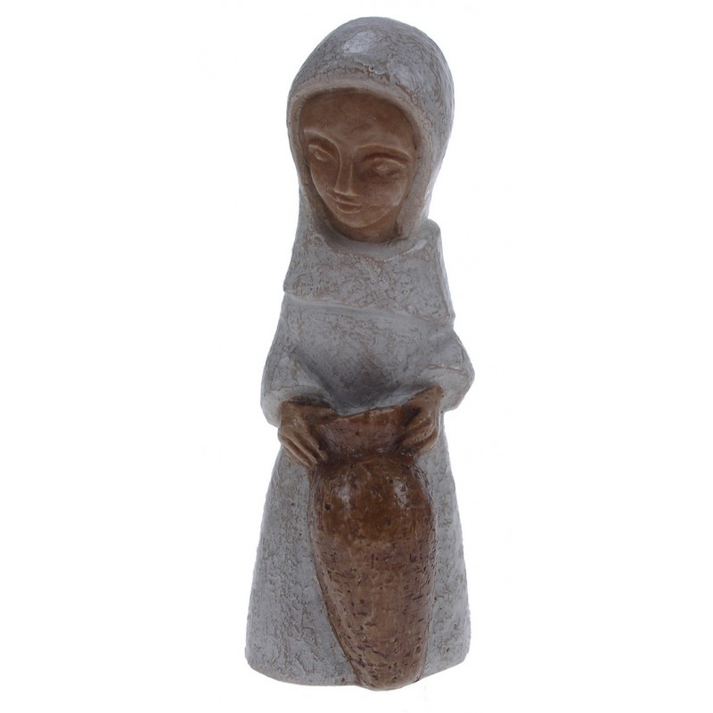 Bergère de couleur blanche et brune en pierre reconstituée fabriquée par les Petites Soeurs de Bethléem. Elle mesure 13 cm de hauteur. Elle complète la crèche également disponible, idéale pour une décoration de Noël originale et intemporelle.