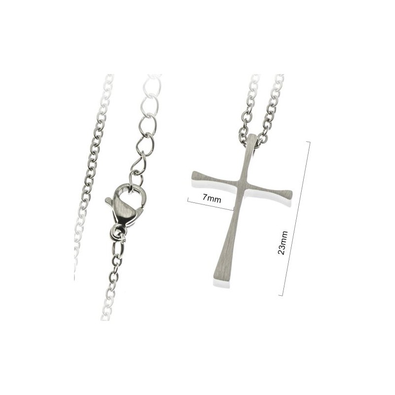 L'article est composé d'un pendentif en forme de croix de 23 mm et d'une chaîne de 45 cm. Les deux bijoux sont en acier inoxydable. La chaîne est présentée dans une élégante boite.