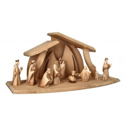 Cette crèche de Noël est réalisée entièrement en bois. Elle est composée d'une étable moderne qui mesure 48x19x24 cm et de douze personnages en bois peint dans des teintes neutres de brun clair à foncé avec une très lègère touche de dorée. Les personnages peuvent être achetés individuellement ce qui vous permet de compléter la crèche d'année en année. La Sainte Famille, les rois, etc