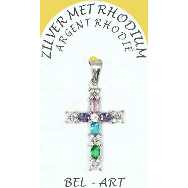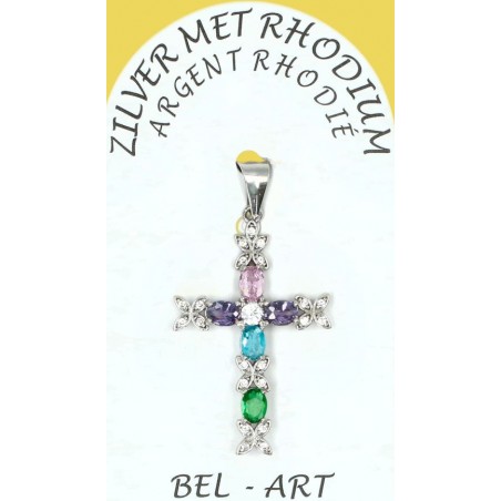 Pendentif croix argent avec zircons multicolores 25 x15 mm