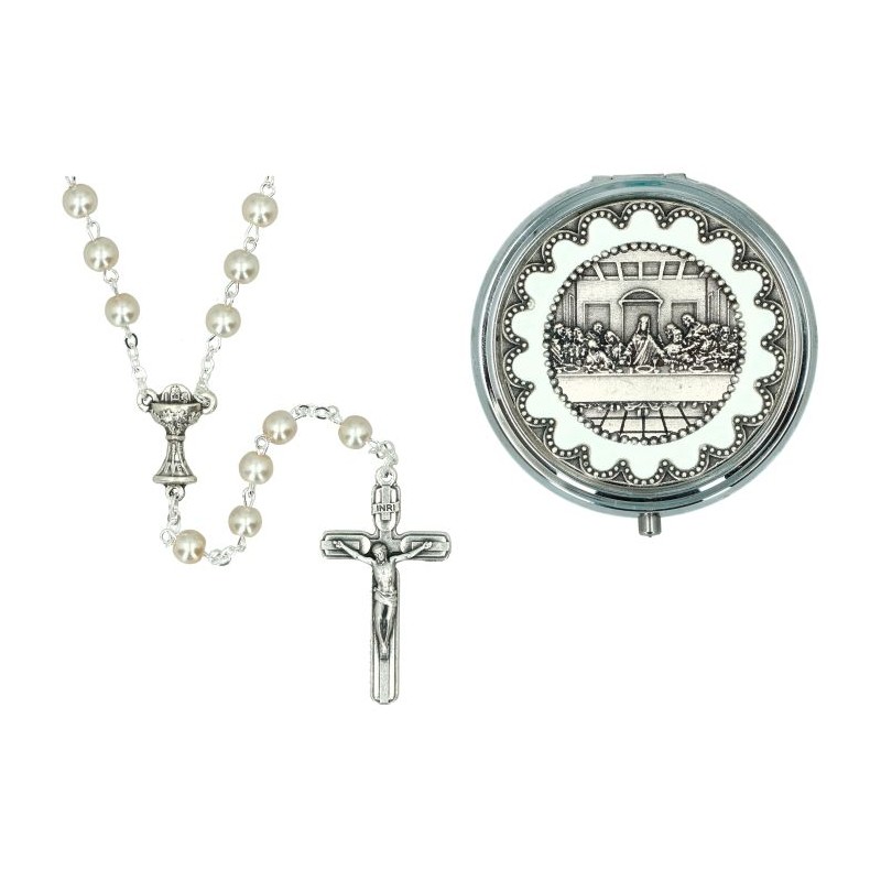 Chapelet blanc de communion + Boîte argentée Dern. Cène Diam 56 mm