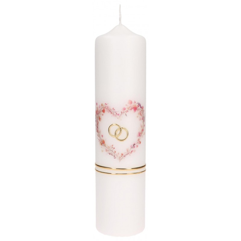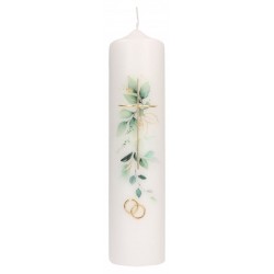 Bougie décorée de symboles religieux représentant le mariage. Le cierge de mariage peut être allumé à l'église durant la cérémonie, béni par le prêtre et repris par les mariés en souvenir. Chaque cierge est emballé dans une boîte individuelle, avec un couvercle transparent.
