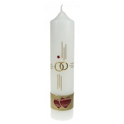 Bougie décorée de symboles religieux représentant le mariage. Le cierge de mariage peut être allumé à l'église durant la cérémonie, béni par le prêtre et repris par les mariés en souvenir. Chaque cierge est emballé dans une boîte individuelle, avec un couvercle transparent.
