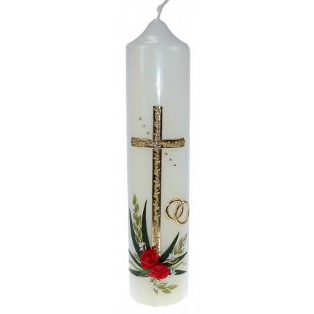 Cierge de mariage - 265 x 60 mm - croix/alliances/roses rouges
