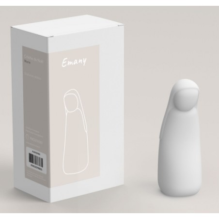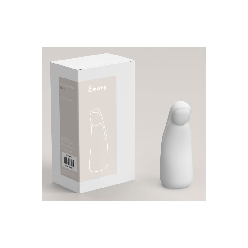 Sainte Marie, en albatre blanc. Simple et élégante, elle fait partie de la crèche Emany, une crèche moderne et minimaliste réalisée par un designer Français. Cette crèche contemporaine est composée de 12 santons : Marie, Joseph, Jésus, l'âne, le boeuf,