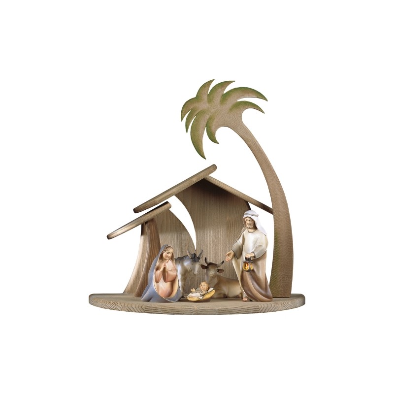 Le set contient : la cabane et son palmier (36 cm de haut) + Marie, Joseph, l'enfant Jésus et son berceau + ane et boeuf