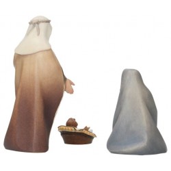Ce set comprend : Jésus, son berceau, Marie et Joseph . Santons en bois. Couleurs pastels. Taille