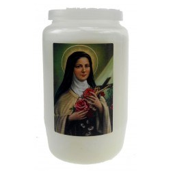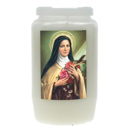 Sainte Thérèse de Lisieux, ou Thérèse de l'Enfant Jésus, est une religieuse carmélite française, dont le retentissement des oeuvres posthumes comme Histoire d'une âme, en font une des plus grandes saintes du XIXème siècle. Sa spiritualité repose sur la recherche de la sainteté dans les actes du quotidien, même les plus insignifiants, à condition de les accomplir dans l'amour de Dieu. Elle est particulièrement vénérée en la basilique de Lisieux, édifiée en son honneur et visitée par plus de 600.000 pèlerins par an. Elle est représentée en habit de carmélite, tenant dans ses mains une croix entourée de roses.
