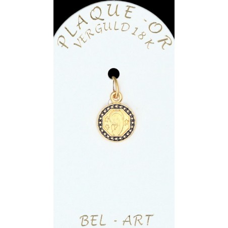 Cette médaille est réalisée en plaqué or. Le bijou est créé en métal et est ensuite recouvert d’une couche d’or. C’est une alternative moins onéreuse à l’or pour un rendu très réussi. Les bijoux en plaqué-or ont une bonne durée de vie, mais il faut éviter de les mettre en contact avec des produits abrasifs.