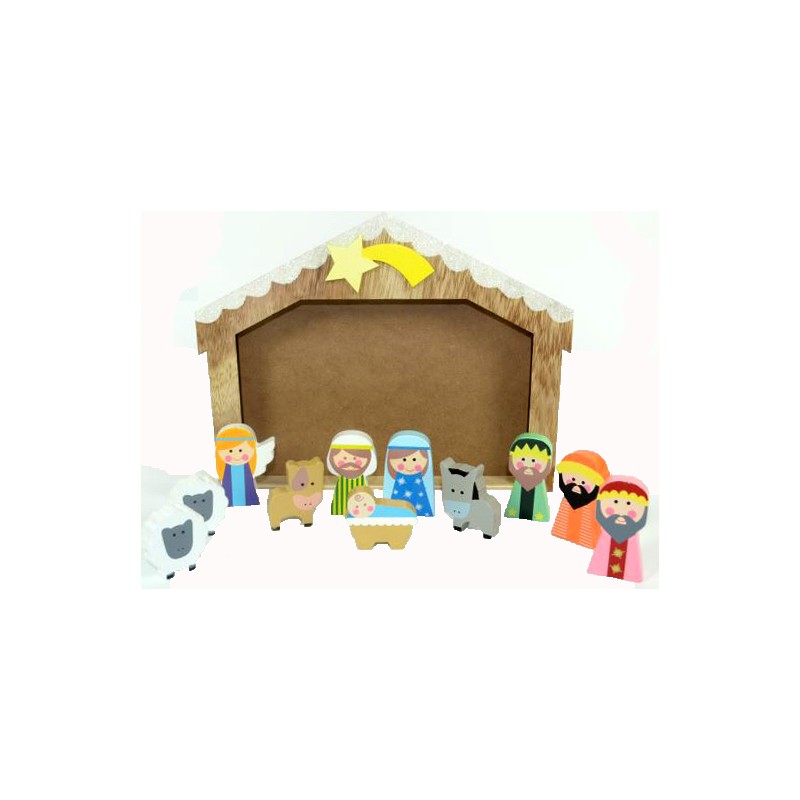 Crèche de Noël de 29cm pour enfant. Cette crèche est une représentation enfantine et moderne de la Nativité, comprenant onze personnages: la Sainte-Famille, l'âne, le boeuf, un ange, les rois mages et deux moutons