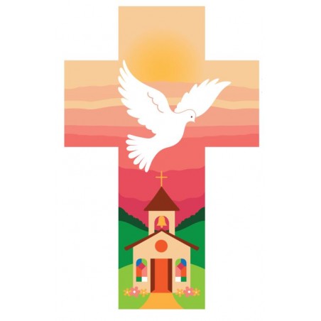 Croix murale colombe et Eglise rose 14 cm