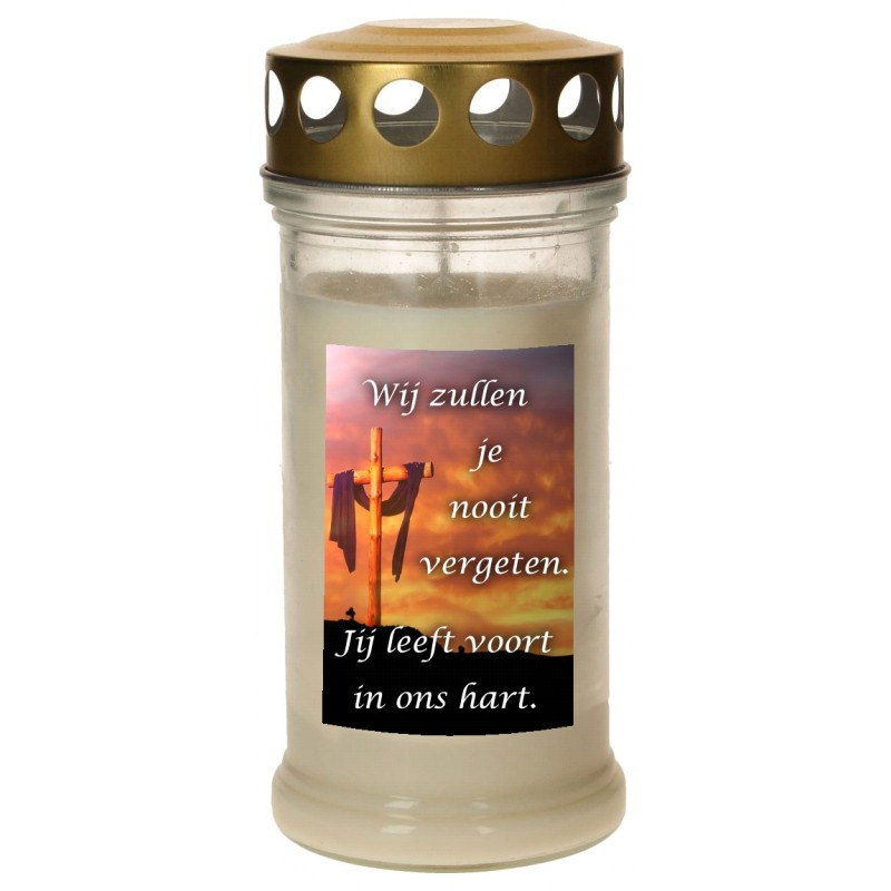 Veilleuse de cimetière en verre avec couvercle doré - Blanc - Wij zullen je nooit vergeten - 10 pièces / carton