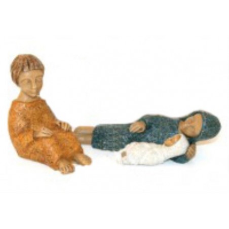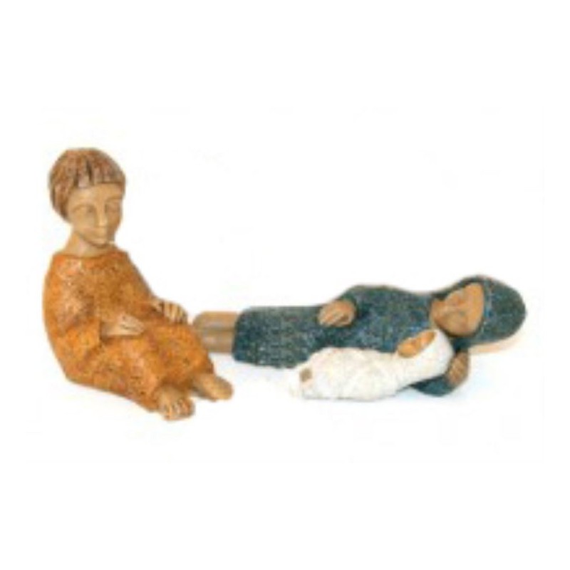 Heilige Familie bestaande uit Maria, Joseph en Kindje Jezus. Gemaakt uit gereconstrueerde steen door "Les Petites Sœurs de Bethléem. Gekleurde uitvoering en 12 cm groot. Originele en tijdloze kerstgroep.