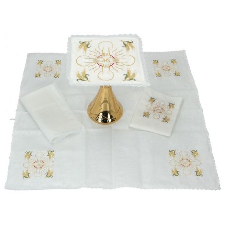 Deze set bevat het volgende altaarlinnen: pale, corporal, purificator en manuterge.