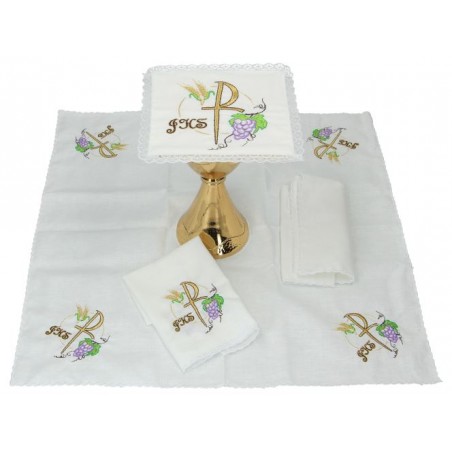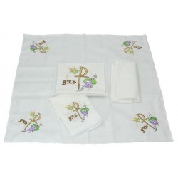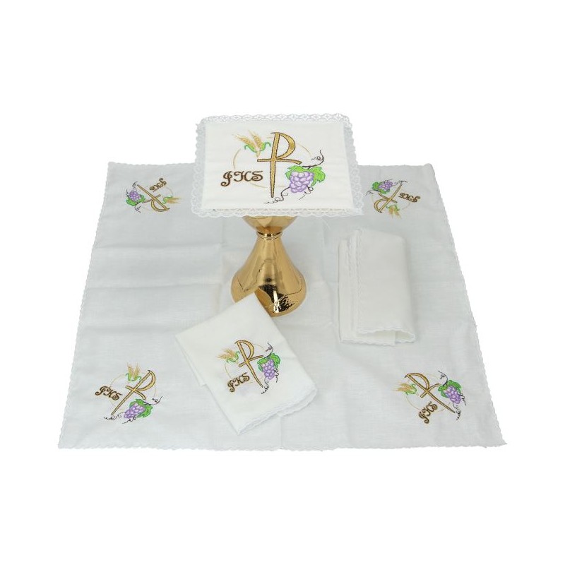Deze set bevat het volgende altaarlinnen: pale, corporal, purificator en manuterge.