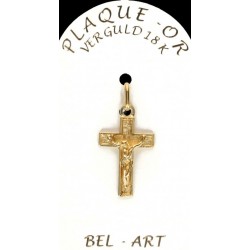 Dit kruisje is vervaardigd uit plaqué or (doublé of goldplated). Dit betekent dat het sieraad uit metaal een laagje goud door middel van elektrolyse krijgt. Het is een goedkoper alternatief voor goud voor een zeer succesvol resultaat.De sieraden in plaqué or hebben een goede levensduur, maar men moet wel vermijden om deze juwelen in contact te brengen met bijtende producten.
