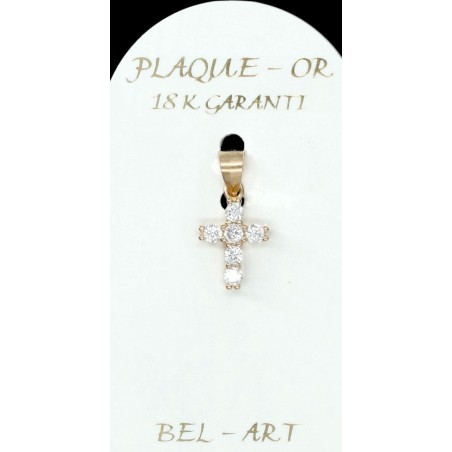 Dit kruisje is vervaardigd uit plaqué or (doublé of goldplated). Dit betekent dat het sieraad uit metaal een laagje goud door middel van elektrolyse krijgt. Het is een goedkoper alternatief voor goud voor een zeer succesvol resultaat.De sieraden in plaqué or hebben een goede levensduur, maar men moet wel vermijden om deze juwelen in contact te brengen met bijtende producten.