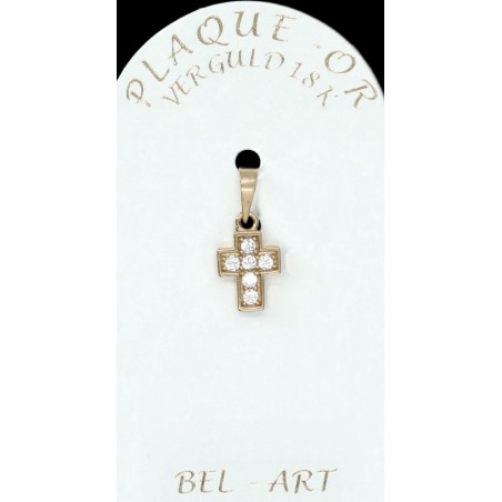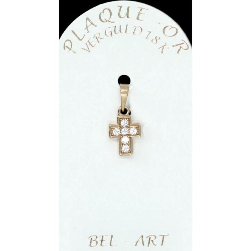 Dit kruisje is vervaardigd uit plaqué or (doublé of goldplated). Dit betekent dat het sieraad uit metaal een laagje goud door middel van elektrolyse krijgt. Het is een goedkoper alternatief voor goud voor een zeer succesvol resultaat.De sieraden in plaqué or hebben een goede levensduur, maar men moet wel vermijden om deze juwelen in contact te brengen met bijtende producten.