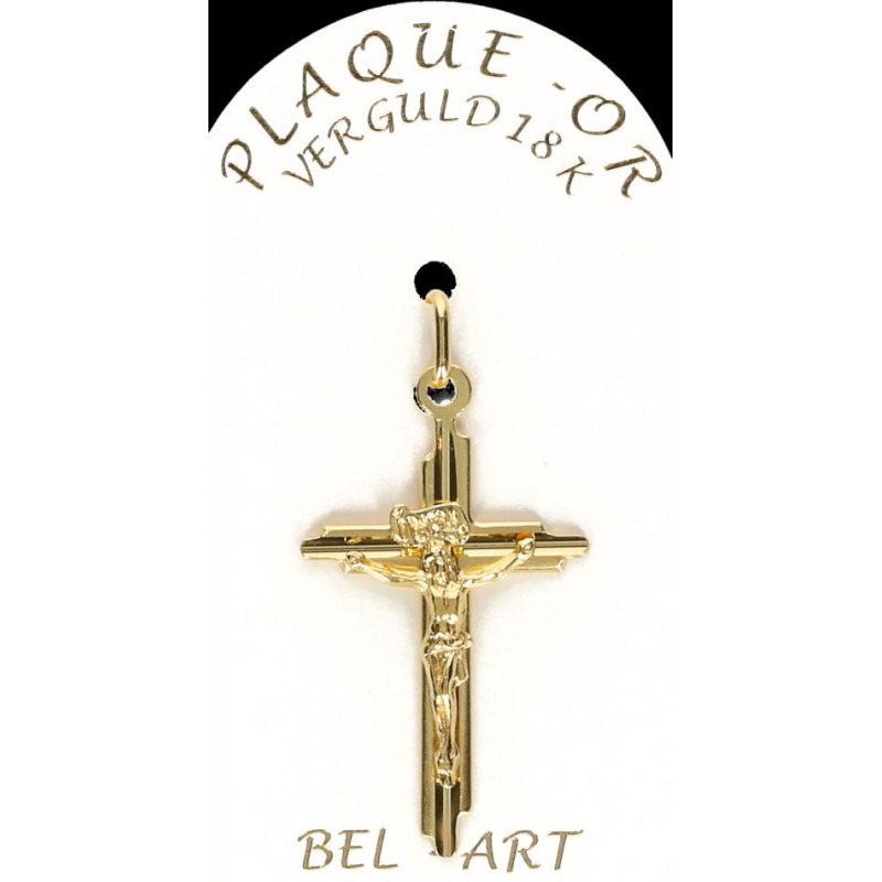 Dit kruisje is vervaardigd uit plaqué or (doublé of goldplated). Dit betekent dat het sieraad uit metaal een laagje goud door middel van elektrolyse krijgt. Het is een goedkoper alternatief voor goud voor een zeer succesvol resultaat.De sieraden in plaqué or hebben een goede levensduur, maar men moet wel vermijden om deze juwelen in contact te brengen met bijtende producten.