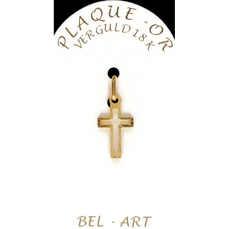 Dit kruisje is vervaardigd uit plaqué or (doublé of goldplated). Dit betekent dat het sieraad uit metaal een laagje goud door middel van elektrolyse krijgt. Het is een goedkoper alternatief voor goud voor een zeer succesvol resultaat.De sieraden in plaqué or hebben een goede levensduur, maar men moet wel vermijden om deze juwelen in contact te brengen met bijtende producten.