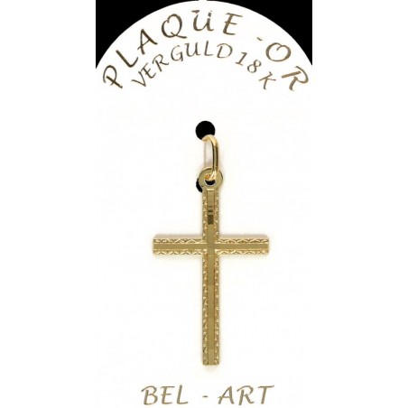 Dit kruisje is vervaardigd uit plaqué or (doublé of goldplated). Dit betekent dat het sieraad uit metaal een laagje goud door middel van elektrolyse krijgt. Het is een goedkoper alternatief voor goud voor een zeer succesvol resultaat.De sieraden in plaqué or hebben een goede levensduur, maar men moet wel vermijden om deze juwelen in contact te brengen met bijtende producten.
