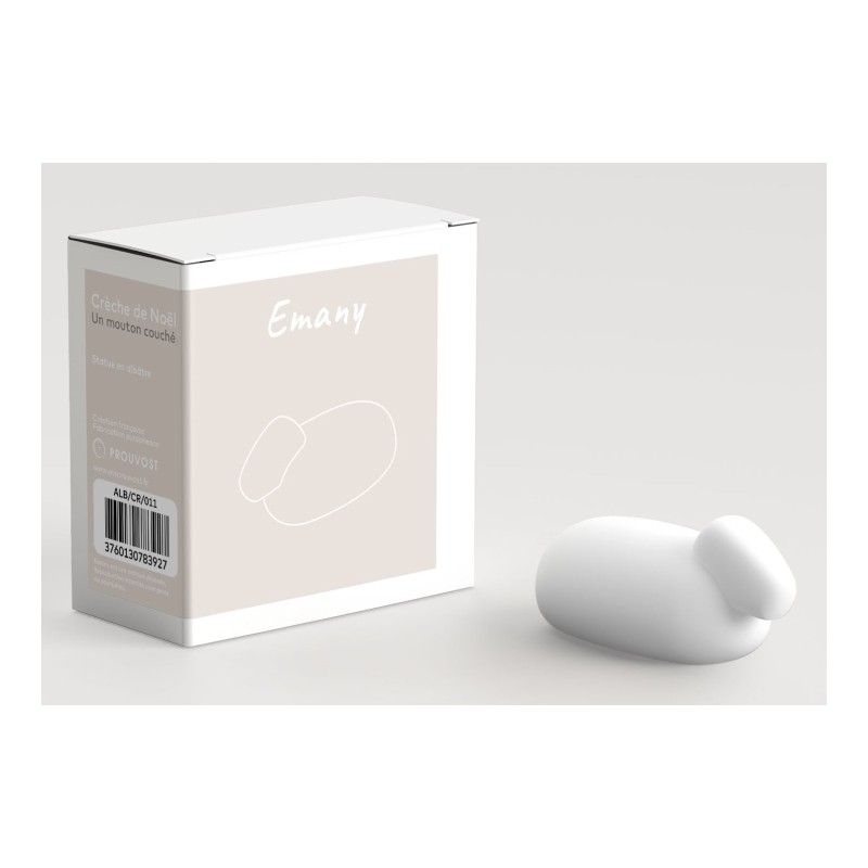 Dit liggend schaap maakt deel uit van de zeer moderne crèche van Emany. Deze kerststal, gemaakt in albast door een Franse ontwerper, is elegant en minimalistisch. De santons zijn apart verkrijgbaar. Deze eigentijdse kerstgroep bestaat uit 12 beeldjes: Maria, Sint-Jozef, Kindje Jezus, de ezel, de os, de drie wijzen, een herder met een schaap in zijn armen, twee schapen en een engel. De stal is gemaakt van massief eikenhout door een Franse vakman (Hauts de France)