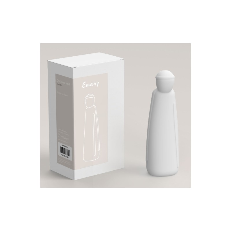 Sint-Jozef behoort tot de heilige familie van deze zeer moderne kerstgroep van Emany. Deze kerststal, gemaakt in albast door een Franse ontwerper, is elegant en minimalistisch. De santons zijn apart verkrijgbaar. Deze eigentijdse kerstgroep bestaat uit 12 beeldjes: Maria, Sint-Jozef, Kindje Jezus, de ezel, de os, de drie wijzen, een herder met een schaap in zijn armen, twee schapen en een engel.