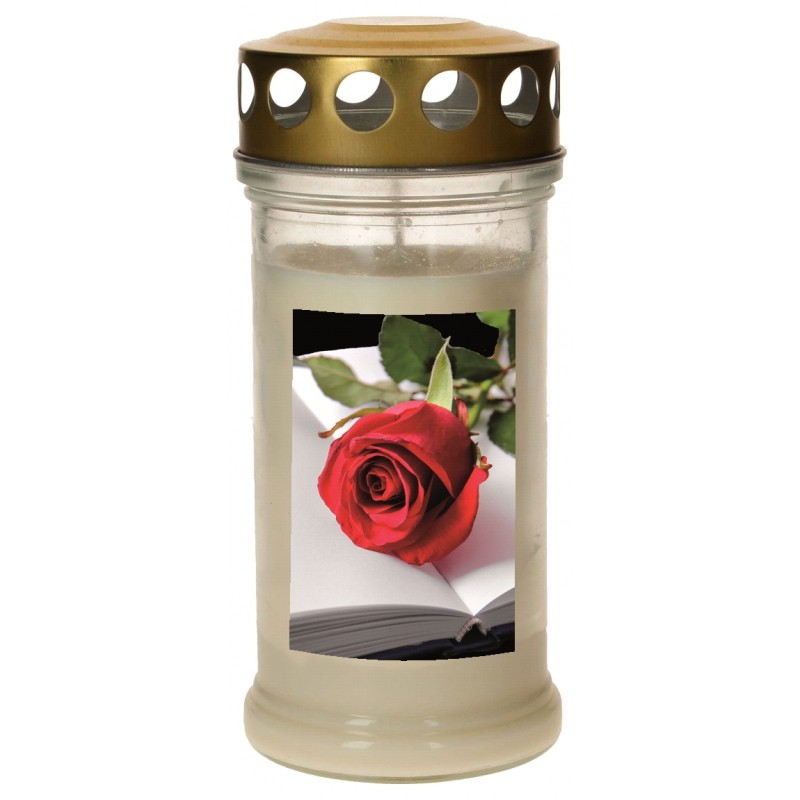 Graflicht in glas met deksel verguld - Open boek met roos - 10 stuks / doos