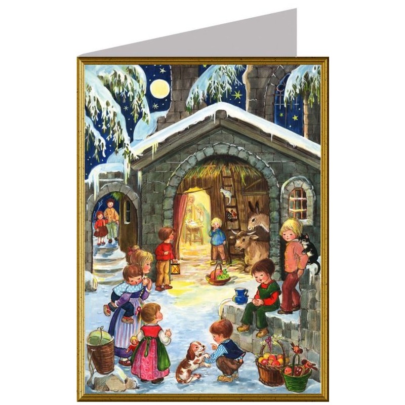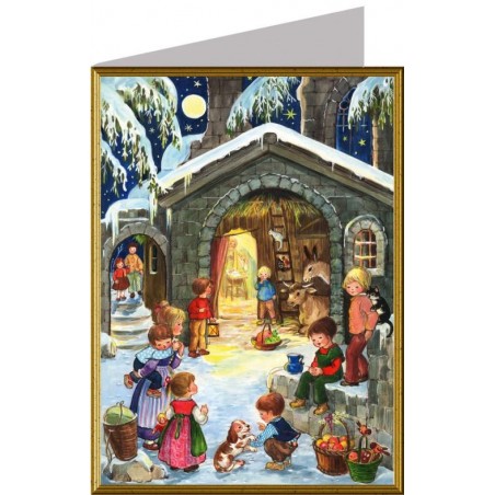Stuur uw kerstgroeten met deze mooie traditionele kerstkaart. De naïeve illustratie roept nostalgie op naar de kerstmissen uit onze kindertijd.