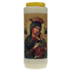 De noveenkaars is altijd wit, de kleur van het plastic kan variëren: rode noveen, blauwe noveen, zwarte noveen, enz.