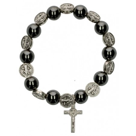 Armband op elastiek - medailles H Benedictus - hematiet