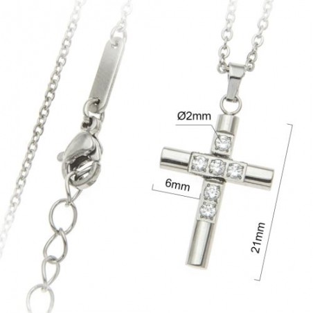 Het artikel bestaat uit een kruis hangertje van 21 mm met zirkoon en een ketting van 45 cm. De twee juwelen zijn in roestvrij staal. Deze ketting is in een mooi doosje verpakt.